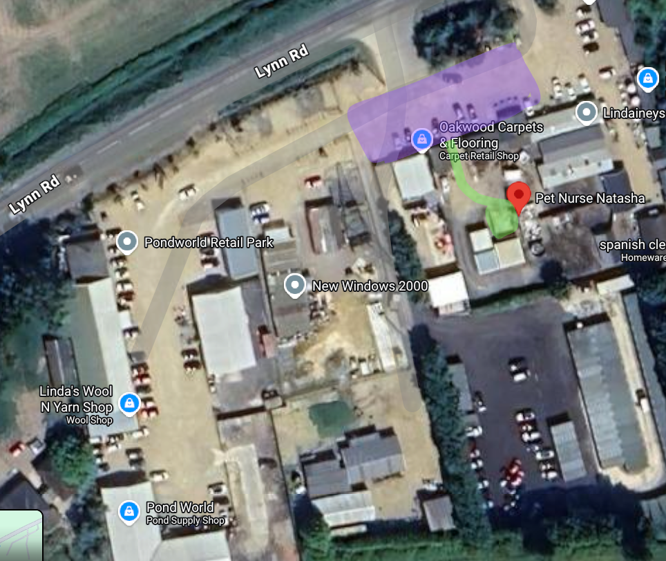 Our address for appointments is: Pet Nurse Natasha, Pondworld Retail Park, Lynn Road, Wisbech, PE14 9DA.